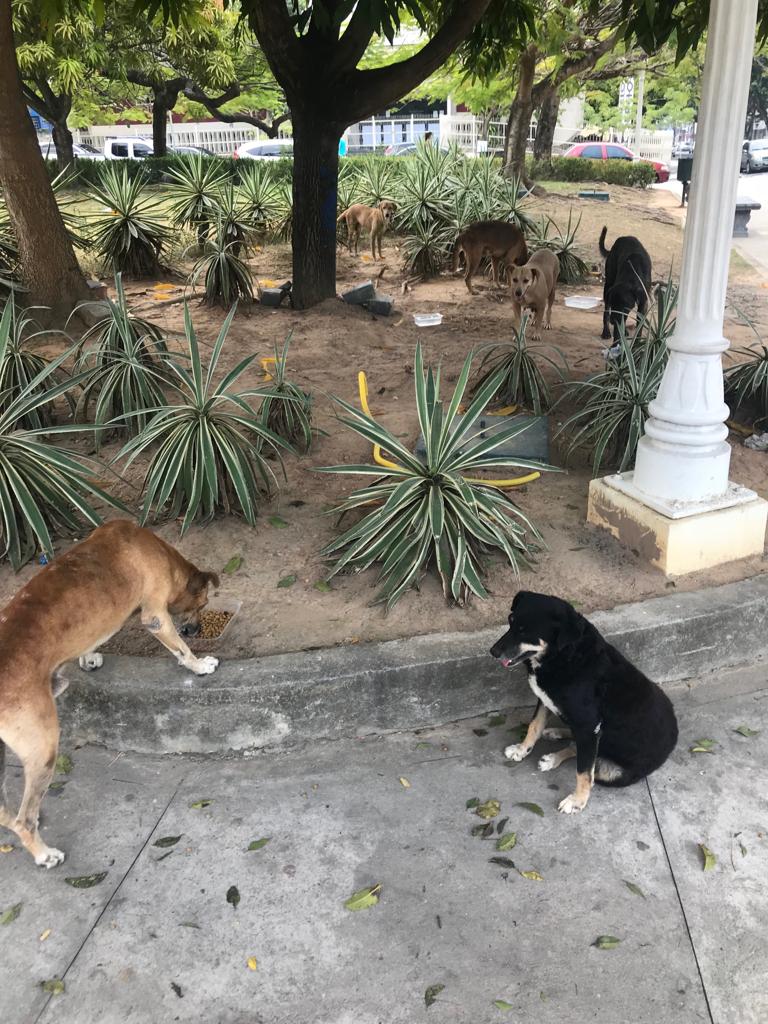 Em frente à praça.